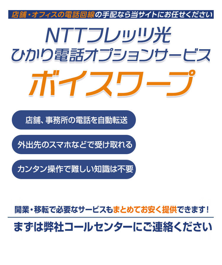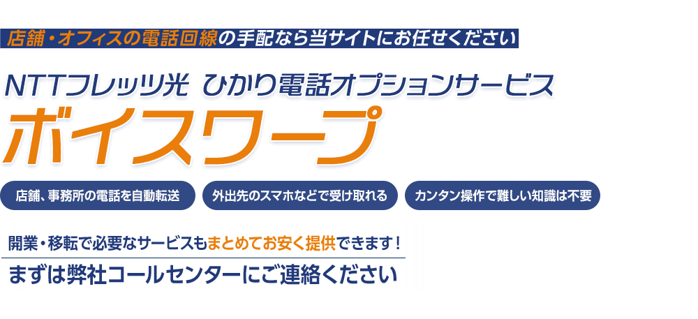 ボイスワープは、店舗や事務所の固定電話にかかってきたお客様からの大切な電話を、外出先の携帯電話などに自動転送できるNTT東日本 ひかり電話のオプションサービスです。
